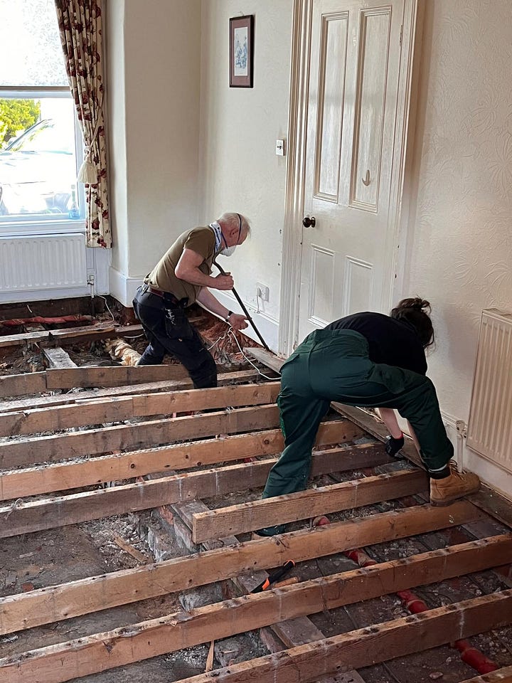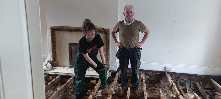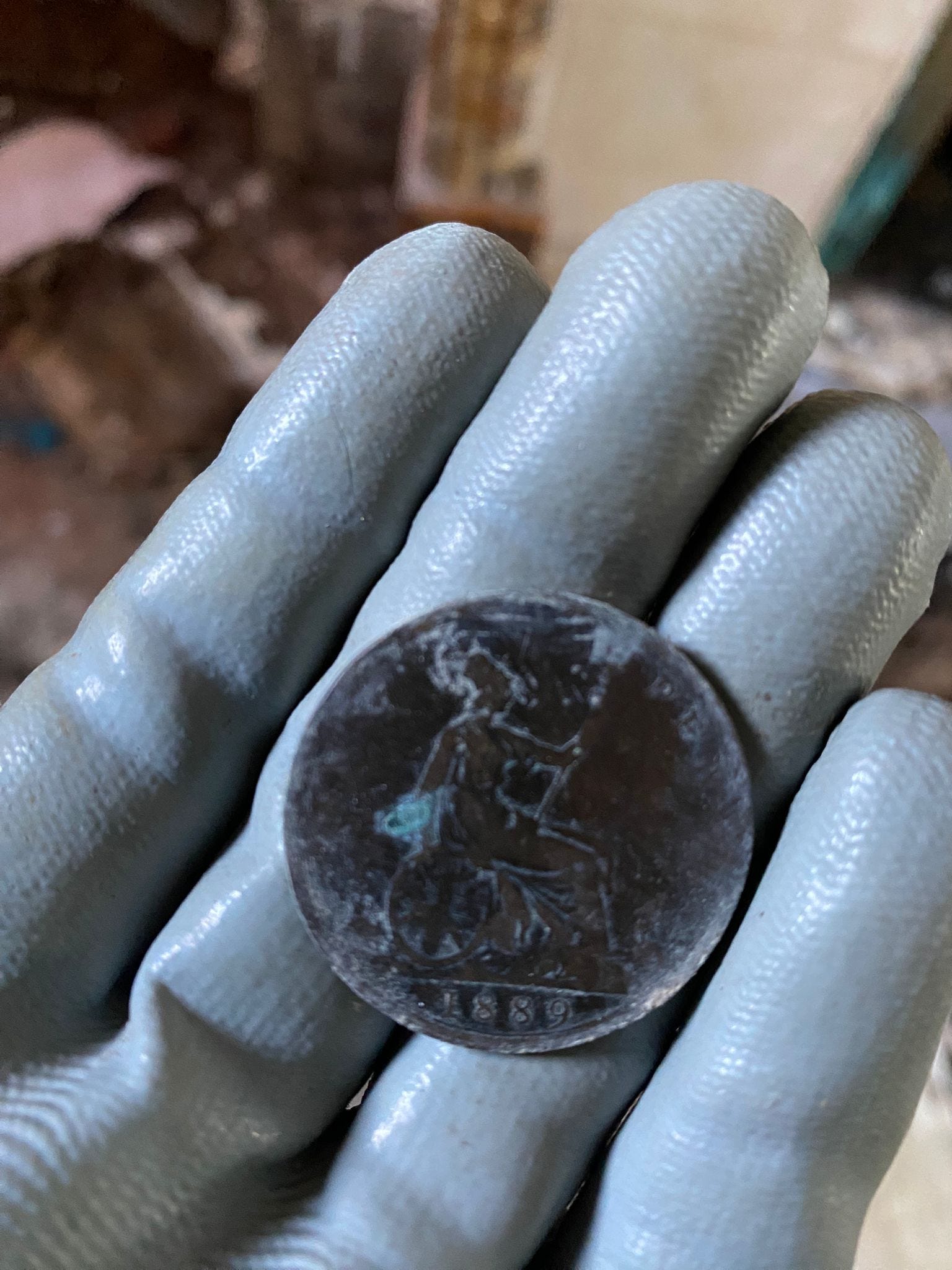 The house was built in 1910 so it needs a bit of love and care. Our first thing to tackle is the floor downstairs. Unfortunately with old boys like this one, dry rot and wood worm are a real thing. So we are stripping two rooms entirely, board by board. We found at coin from 1889! We put it back where we found it just incase it is structurally supporting the entire house.